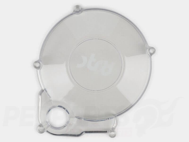 STR8 transparent flywheel/ ignition cover for Minarelli AM6 50cc 2-stroke engines.