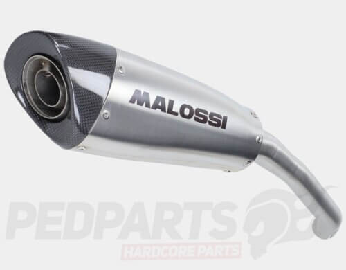 The Malossi RX MHR exhaust system is a high-performance racing exhaust. Its light-weight construction offers a significant weight reduction of up to 3.5 kg compared to previous models. The exhaust features a variable geometry casing made from brushed stainless steel, utilising hydroforming technology. It incorporates a carbon end cap and is equipped with highly sound-absorbent materials to minimise noise. The system is assembled with watertight stainless steel rivets and showcases a laser-marked Malossi logo. Three silent-blocks are included to reduce vibrations and a shaped plate with three fasteners ensures easy and quick assembly.