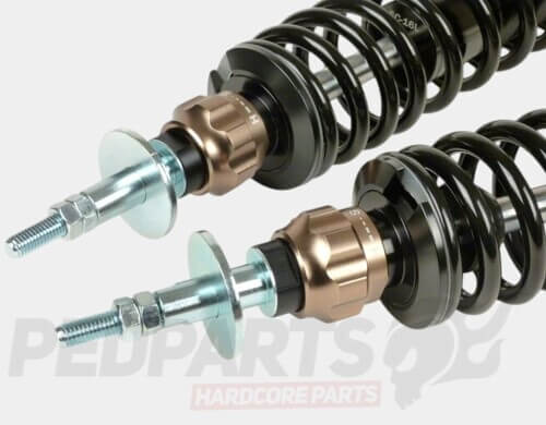 High-performance rear suspension kit engineered for Vespa. Designed for sport tuning and everyday reliability; direct fit replacement without modification, ideal for riders seeking improved rear-end control, sharper response and premium suspension behaviour.