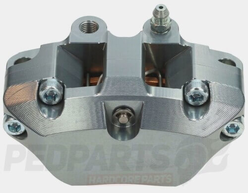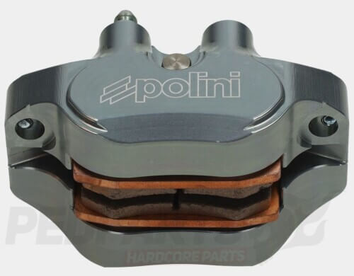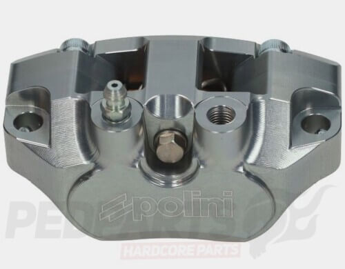 The Polini brake caliper is precision-machined from a single block of hard-anodised aerodynamic aluminium. Upgrading from 2 to 4 pistons increases friction surface by 30%, reducing temperature peaks for enhanced reliability and longer lifespan compared to standard calipers.