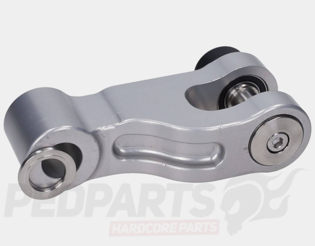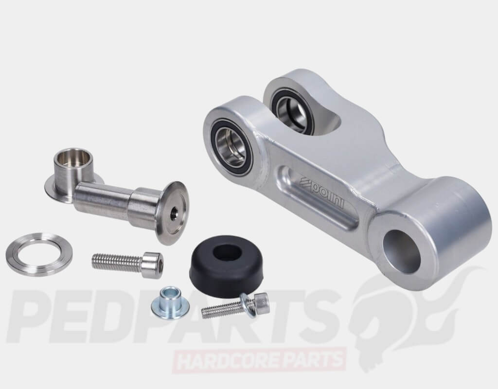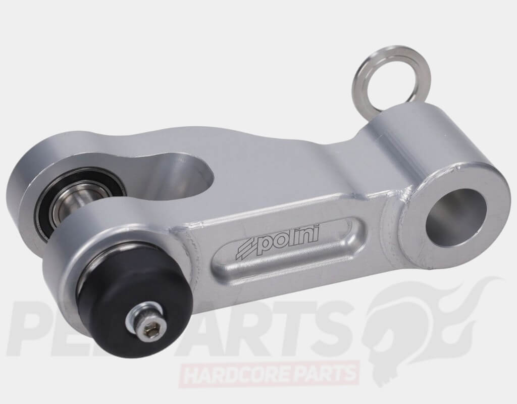 The Polini suspension arm is a 4-bearing upgrade designed for the Polini Evolution fork and can also be used with standard Piaggio fork legs. It provides increased rigidity, smoother movement, and longer service life compared to standard suspension arms.