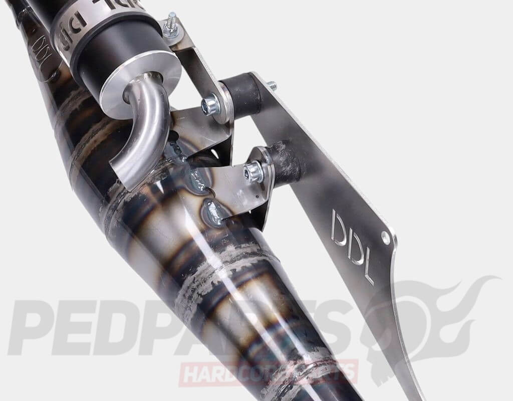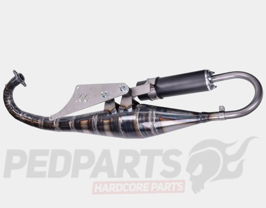 Sports exhaust designed for engines fitted with low-revving 70cc cast-iron sport cylinders (e.g. Malossi Sport, Stage6 Streetrace, Polini Sport). Built to deliver strong mid-range torque and solid everyday rideability rather than high-RPM peak power. With the DDL Street exhaust you get features usually only found on high-end racing exhausts at an entry-level tune. A Powerful upgrade for street-focused 70cc builds.