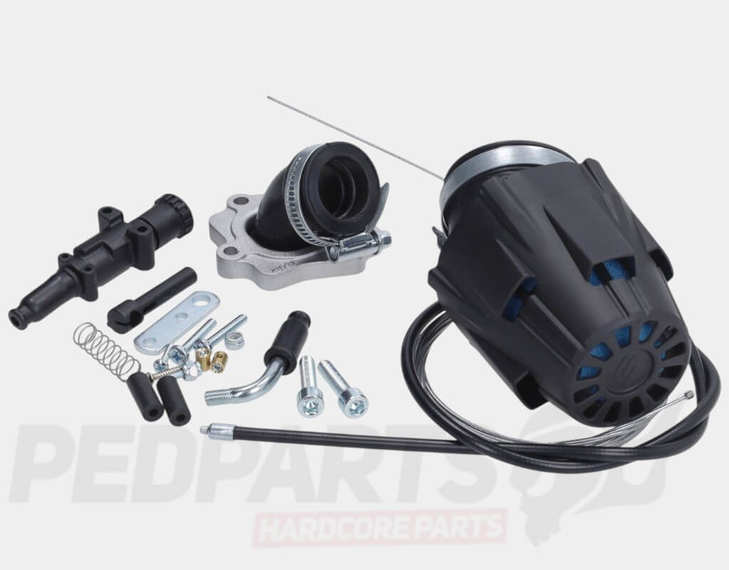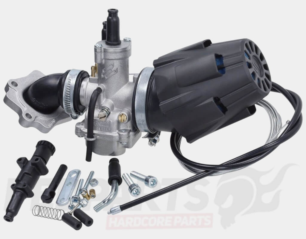 Complete carburettor intake system developed by Polini Motori for Minarelli-based 50cc 2-stroke engines. Designed to optimise airflow and mixture atomisation for improved throttle response, reliability, and performance on tuned or stock setups.