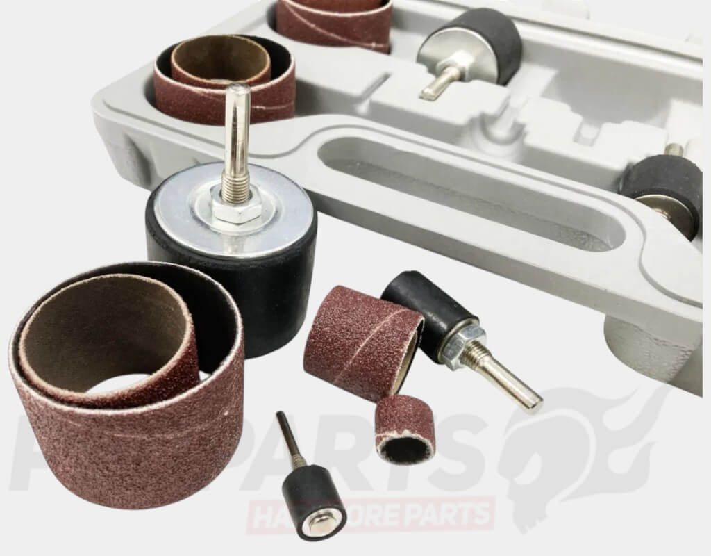 Included:Drum sizes: 13, 19, 25, 38 & 50mm.2 sets of fine (120g)sleeves. 2 sets of coarse (80g) sleeves.