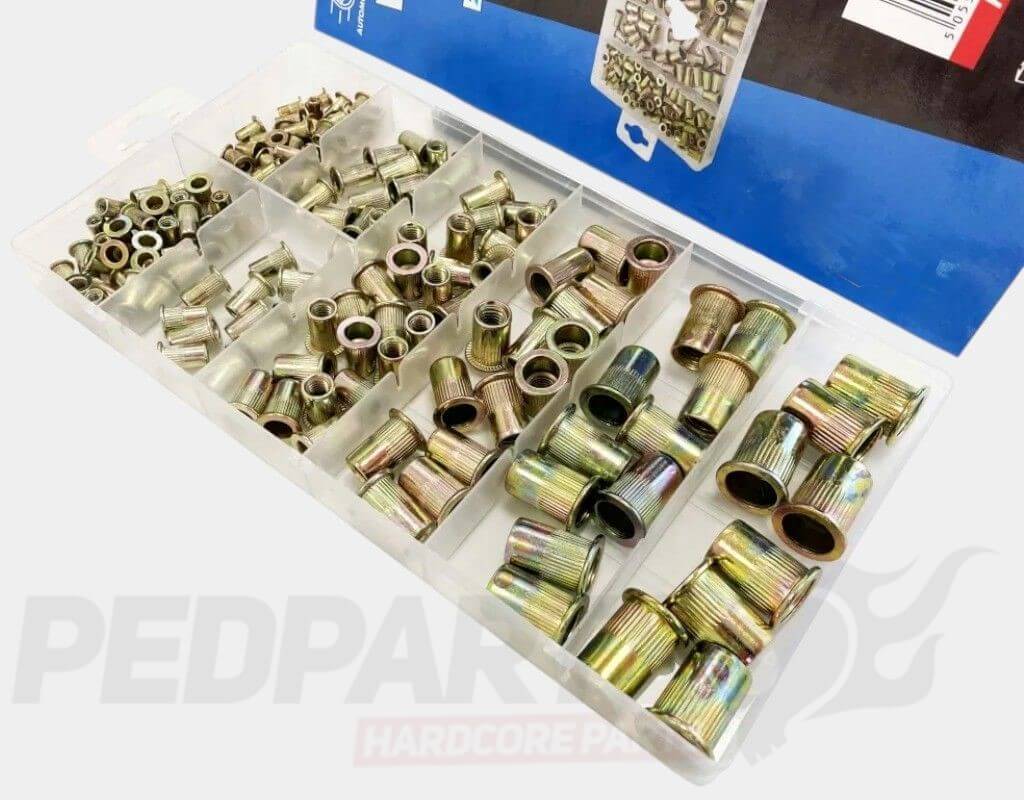 Handy assortment of flange head rivet nuts. Supplied in a plastic storage case.