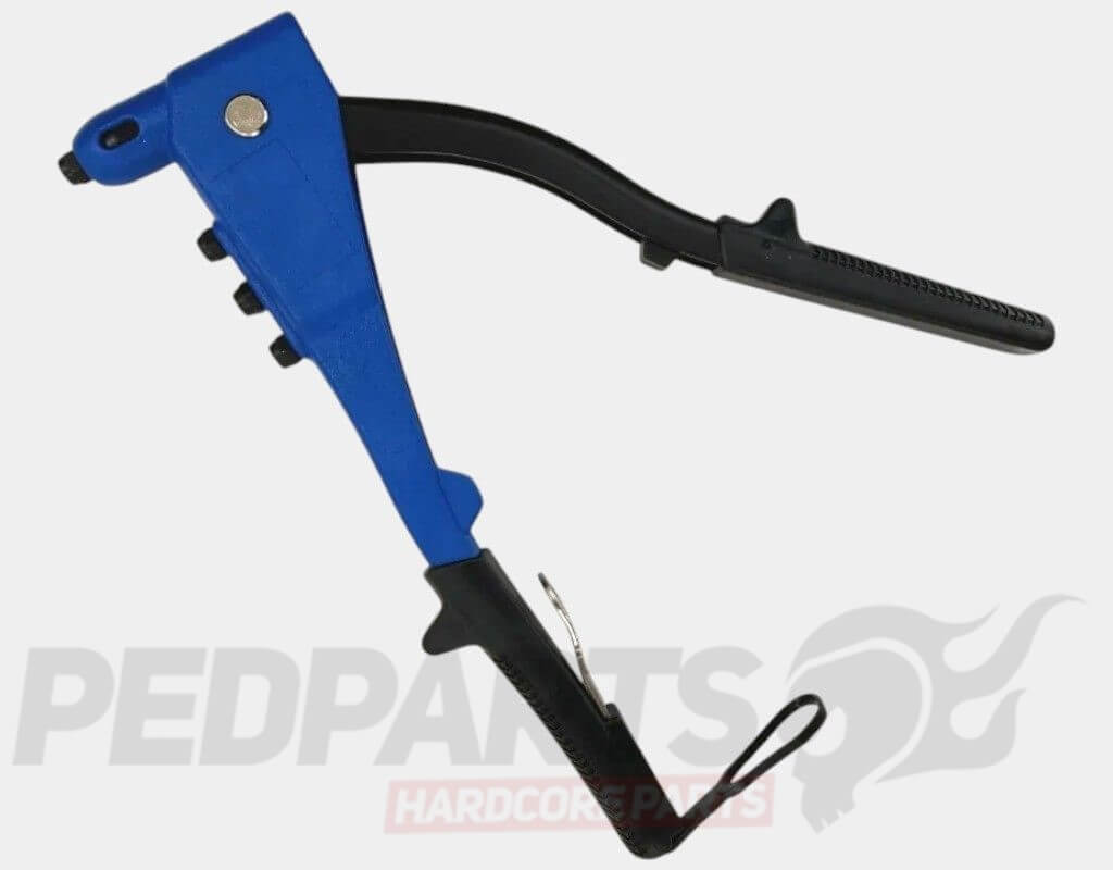 Heavy duty steel construction. Includes 4 interchangeable rivet nozzles & spanner to fit. Sets blind rivets by changing the quick switch screw for automatic ejection of mandrel.