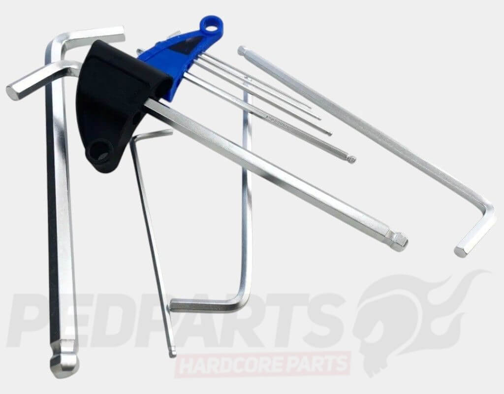 Combination ball and hex keys in handy plastic holder. Chrome vanadium.