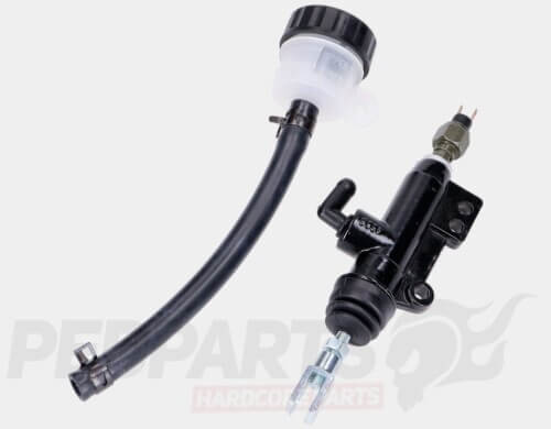 Universal rear brake pump with remote reservoir & brake light switch. The push rod can be removed by removing the retaining circlip.