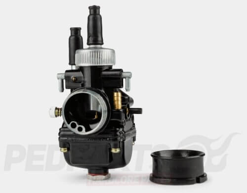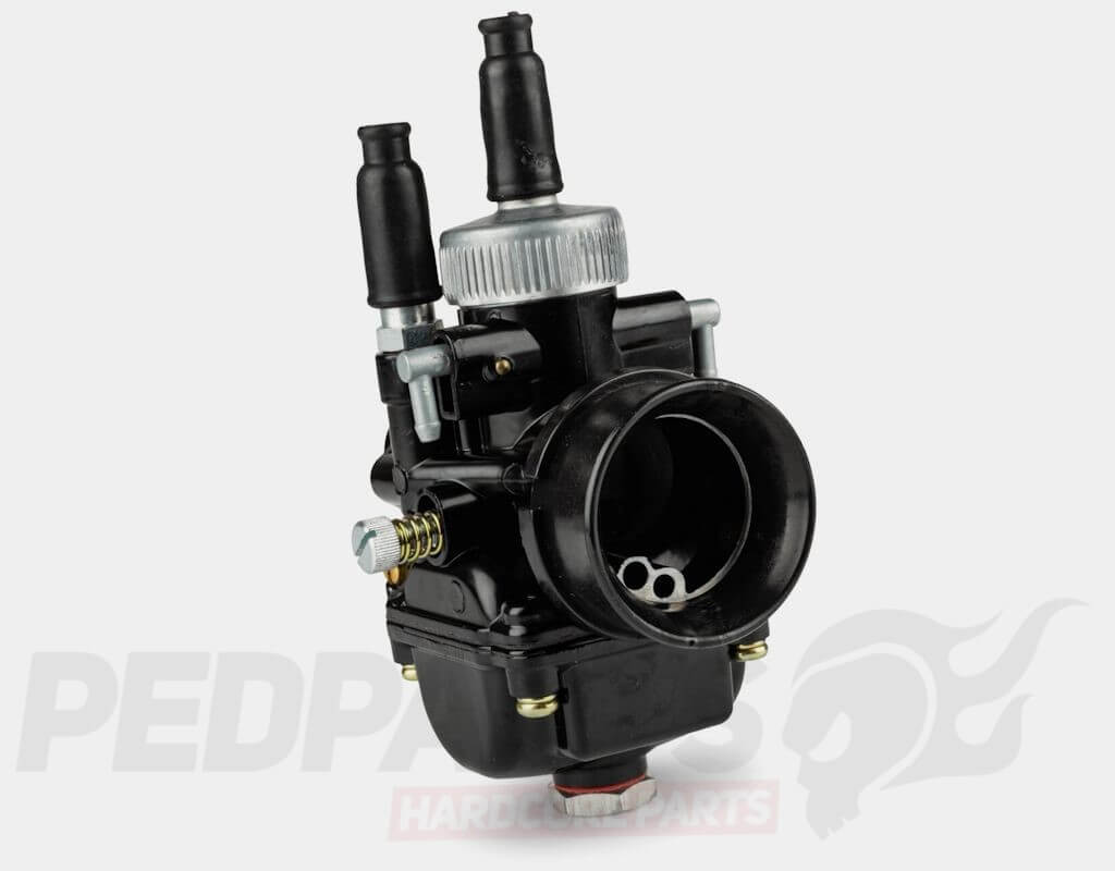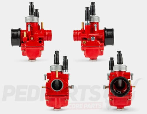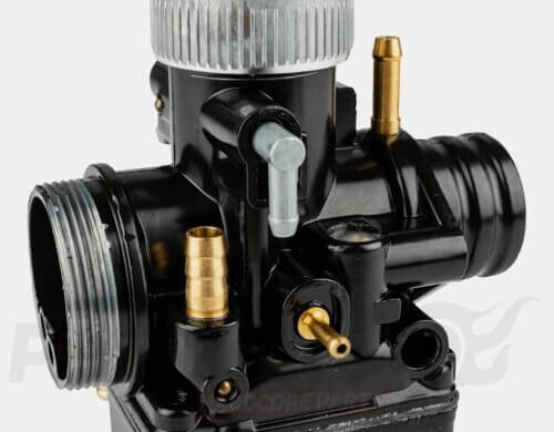 These have vacuum and an oil inlets/ outlets. Manual choke. The advantage of this version is its float bowl screw allowing for quick changing of the jet. The colour adds a custom "racing" touch.