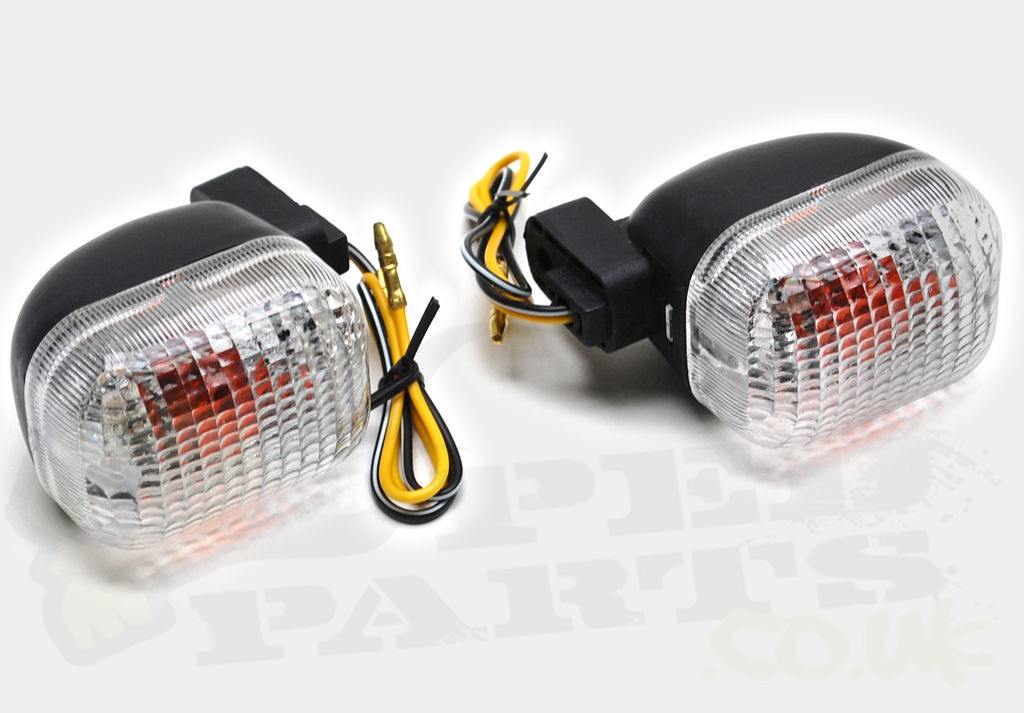 Pair of rear indicators for Peugeot Trekker mopeds.Complete with the bulbs and wire for the left and right hand side.