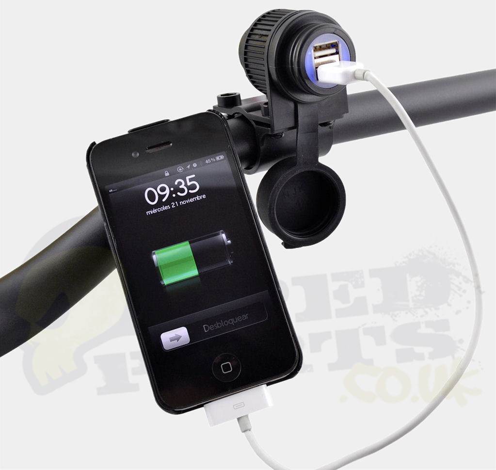 12volt power supply socket kit for motorcycles or scooters. Ideal for powering devices such as a satnav or mobile phone. Can be used with the supplied handlebar bracket or can used without bracket to neatly secure it into a panel.