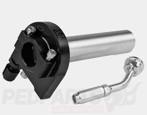 CNC machined from single pieces of aluminium alloy and available in a range of anodised finishes. The throttle tube is threaded (left hand) and detachable from the throttle cam, making it easily serviced. The throttle cam has 5 positions for the cable and the cable adjusters included allow for a wide range of applications. This throttle has the possibility to be used with a return cable also.