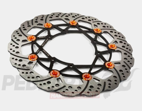 Made in Italy, designed and tested for the race track and on the race track. The technology and materials used is normally only found on superbikes. The floating disc not only looks great but it also has technical advantages; reduced weight and more evenly distributed braking force.