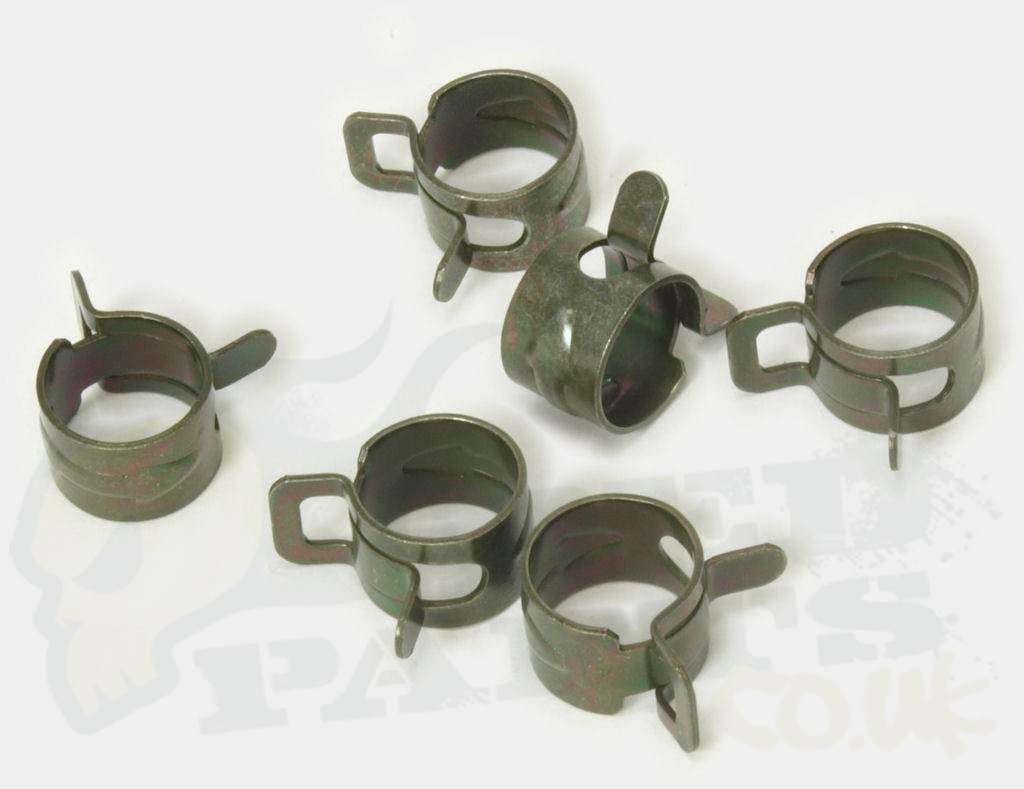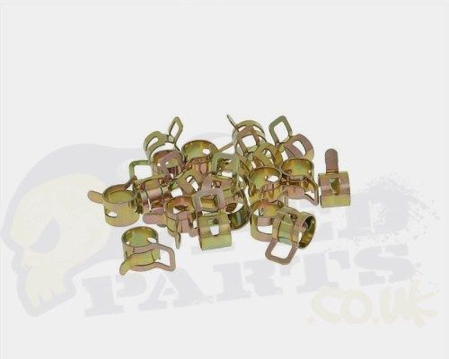Quality re-useable fuel hose clips for 6mm bore (or thereabouts) fuel pipe as commonly used on mopeds and scooters.