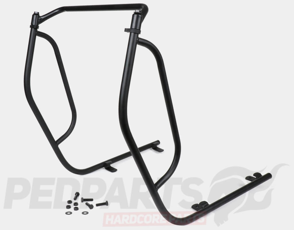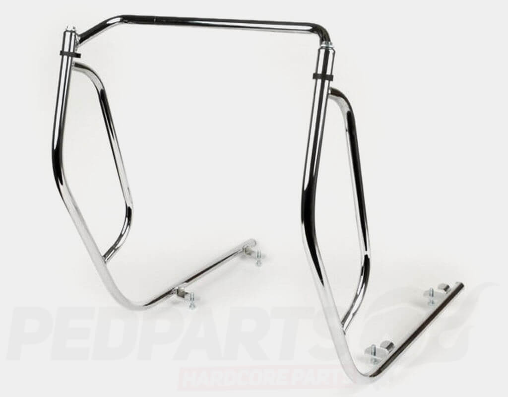 1980's inspired crash bars are a functional accessory. Protect your scooter with this 3 piece set. No drilling is necessary, the screws and nuts provided clamp it to the foot board.