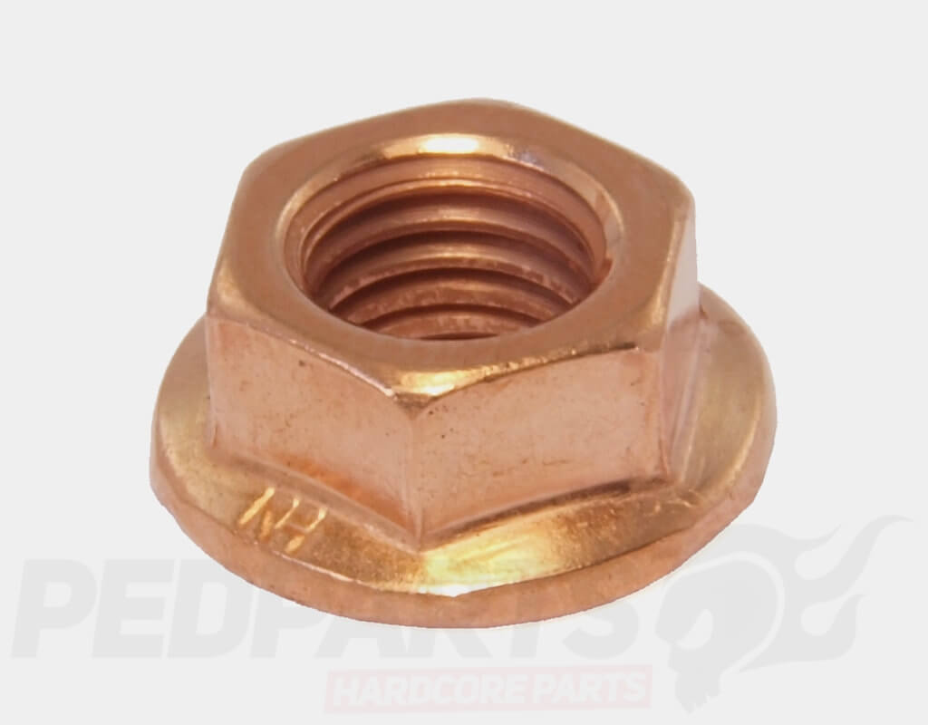 M7 copper exhaust manifold flanged nuts for Piaggio 125-300cc 4-stroke maxi-scooters.