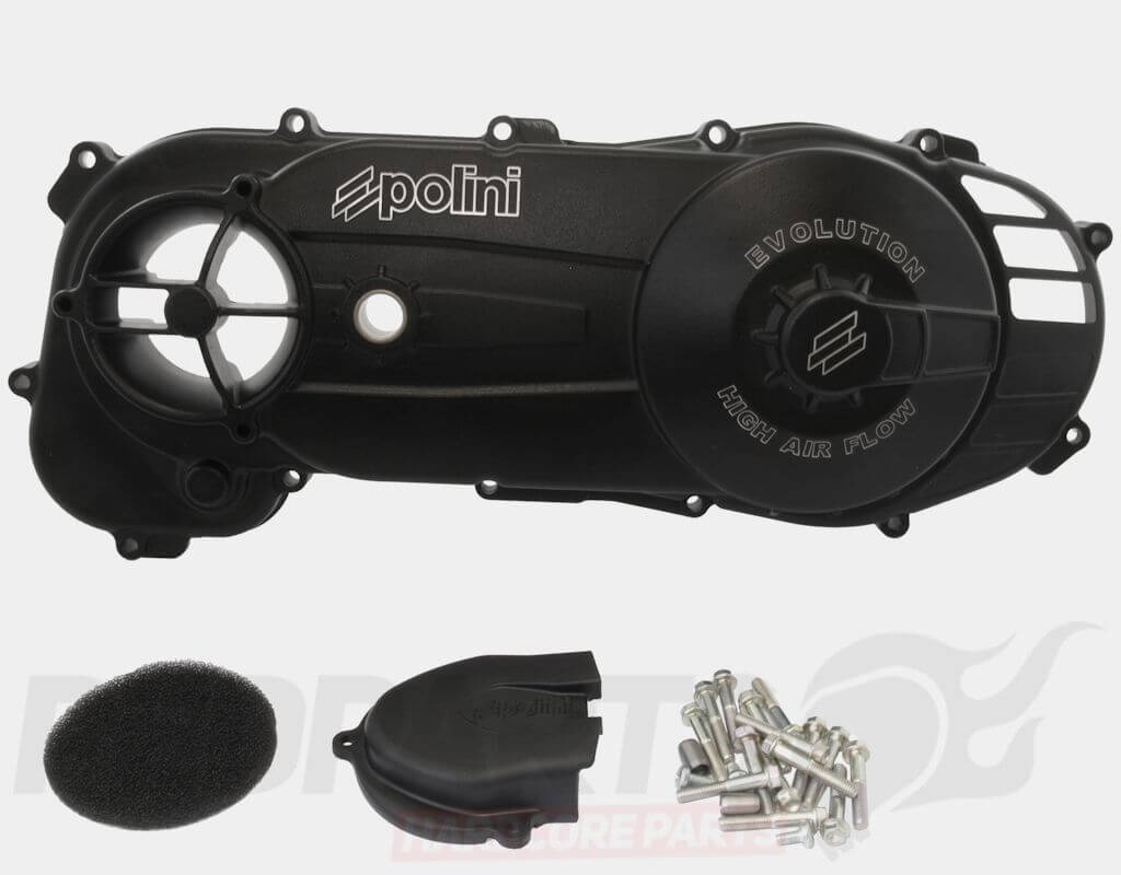 Polini Evolution transmission cover for Piaggio/ Vespa 50cc 2-stroke engines with 10 inch wheels.